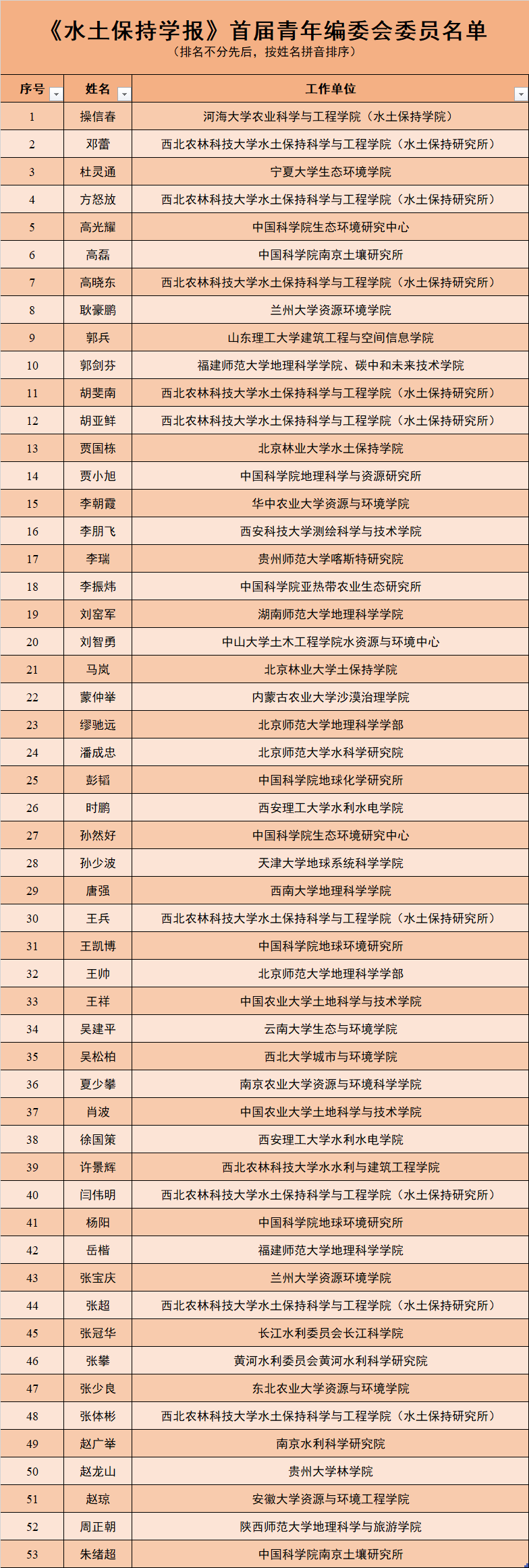 自招募通知发布以来,受到广大青年学者的广泛关注和热烈响应,《水土保持学报》编辑部也收到众多优秀青年学者的报名申请,在此衷心感谢各位学者对《水土保持学报》的关注和支持。通过个人自荐、编委推荐、定向邀请等方式,共收到来自全国各地高校和科研院所的申请198份,申请者都非常优秀,在不同研究领域成绩突出,综合考量申请者的研究方向覆盖面、地域覆盖度、机构单位代表性以及申请者参与本刊工作情况等因素,经编辑部初选、编委会审议、主办单位审定,最终遴选出来自35个单位的53位青年学者成立《水土保持学报》首届青年编委会,并将暂未入选的学者纳入期刊审稿专家库,后期不定期组织增选工作。